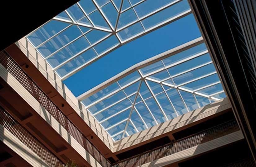 An architectural glass roof system that opens and closes to allow natural light and ventilation.